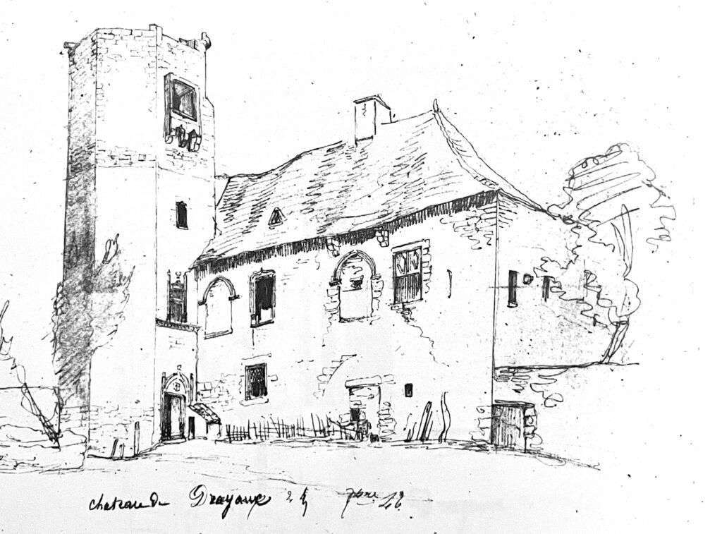 Léo Drouyn a également dessiné le portail de l’ancienne église paroissiale de Drayaux, alors en ruines au pied du château, sauvant de l’oubli ce vestige de l’environnement immédiat de la demeure seigneuriale.