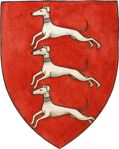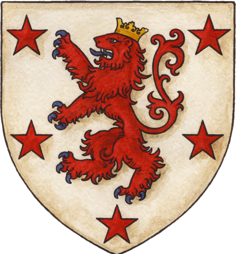D'argent au lion de gueules armé, lampassé et couronné d'azur, accompagné de cinq étoiles de gueules posées en orle.