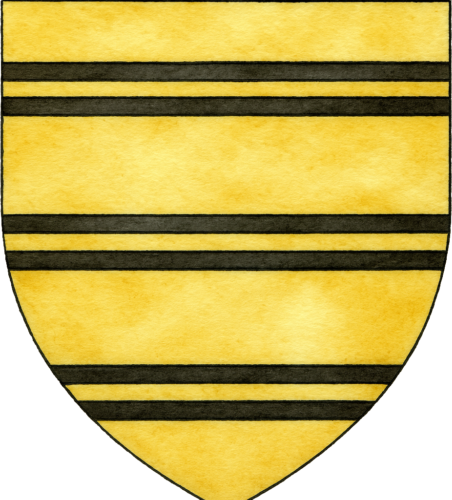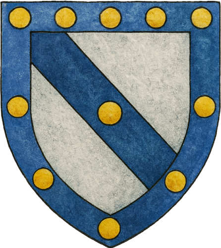 D'argent à une bande d'azur chargée d'un besan d'or, à une bordure aussi d'azur chargée de dix besans d'or, posés cinq en chef, deux en flancs et trois en pointe.